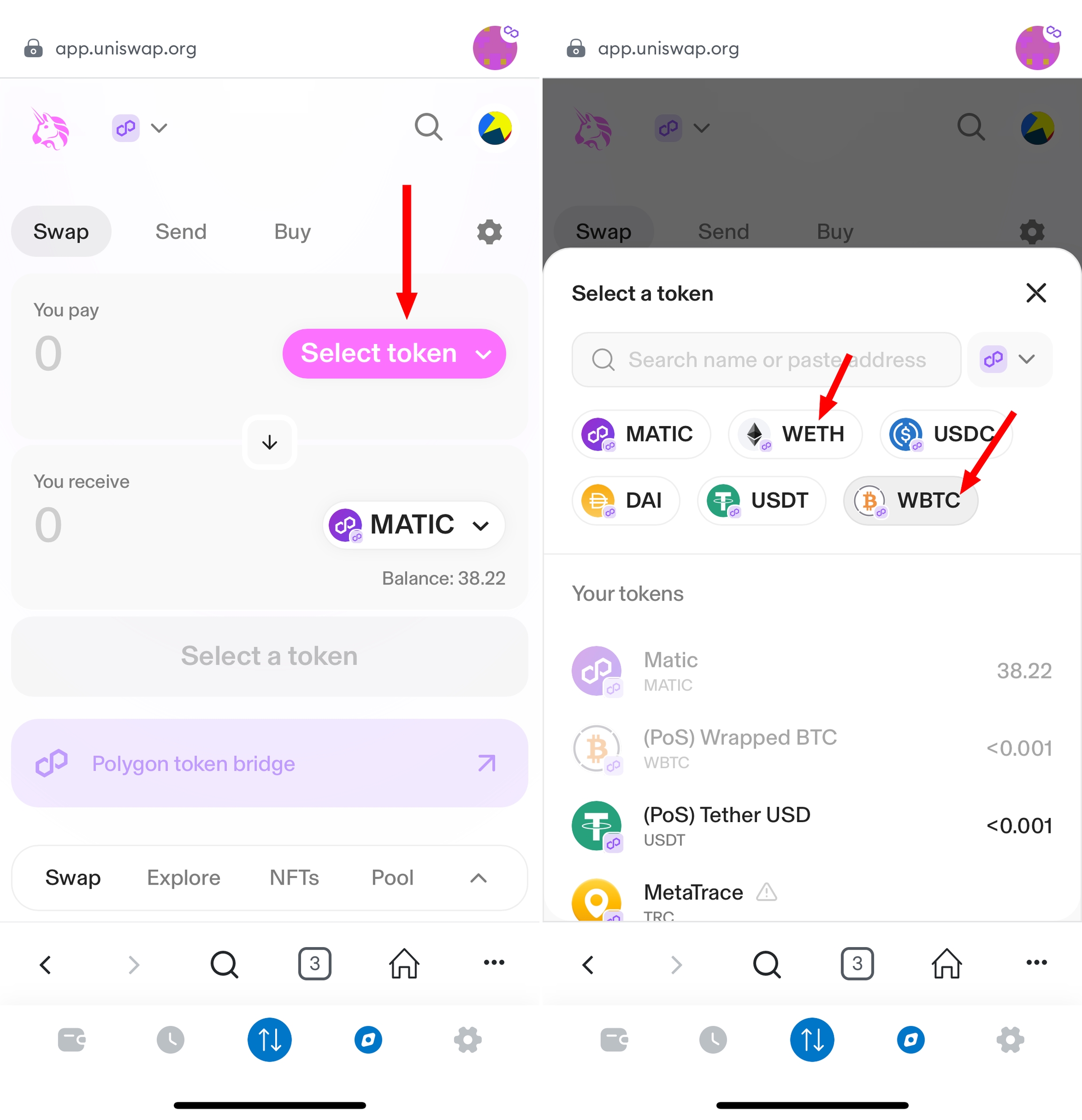 After binding the wallet, select the token we want to exchange for Matic. If ETH/BTC tokens are not shown in the list, you can find them by the contract address