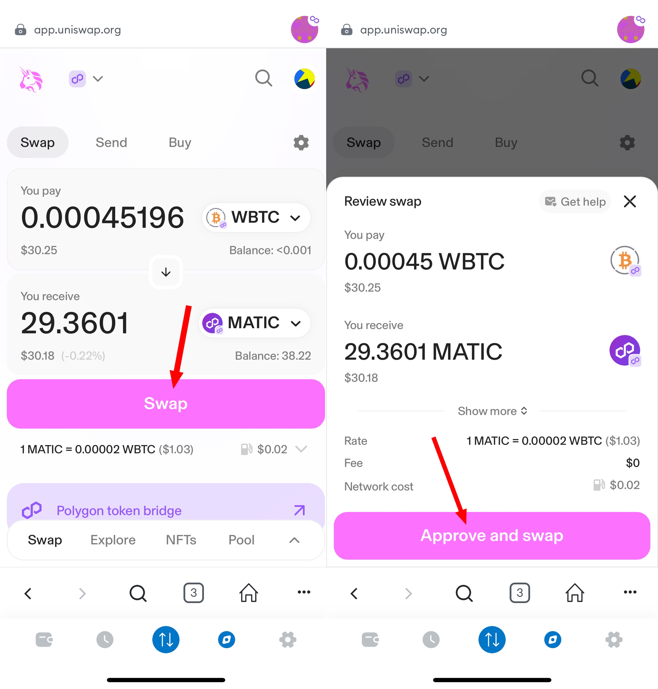 When exchanging we can see the preliminary amount of exchange, click "Exchange" and confirm the transaction. It is recommended to leave from 0.1 Matic to pay for the transaction.