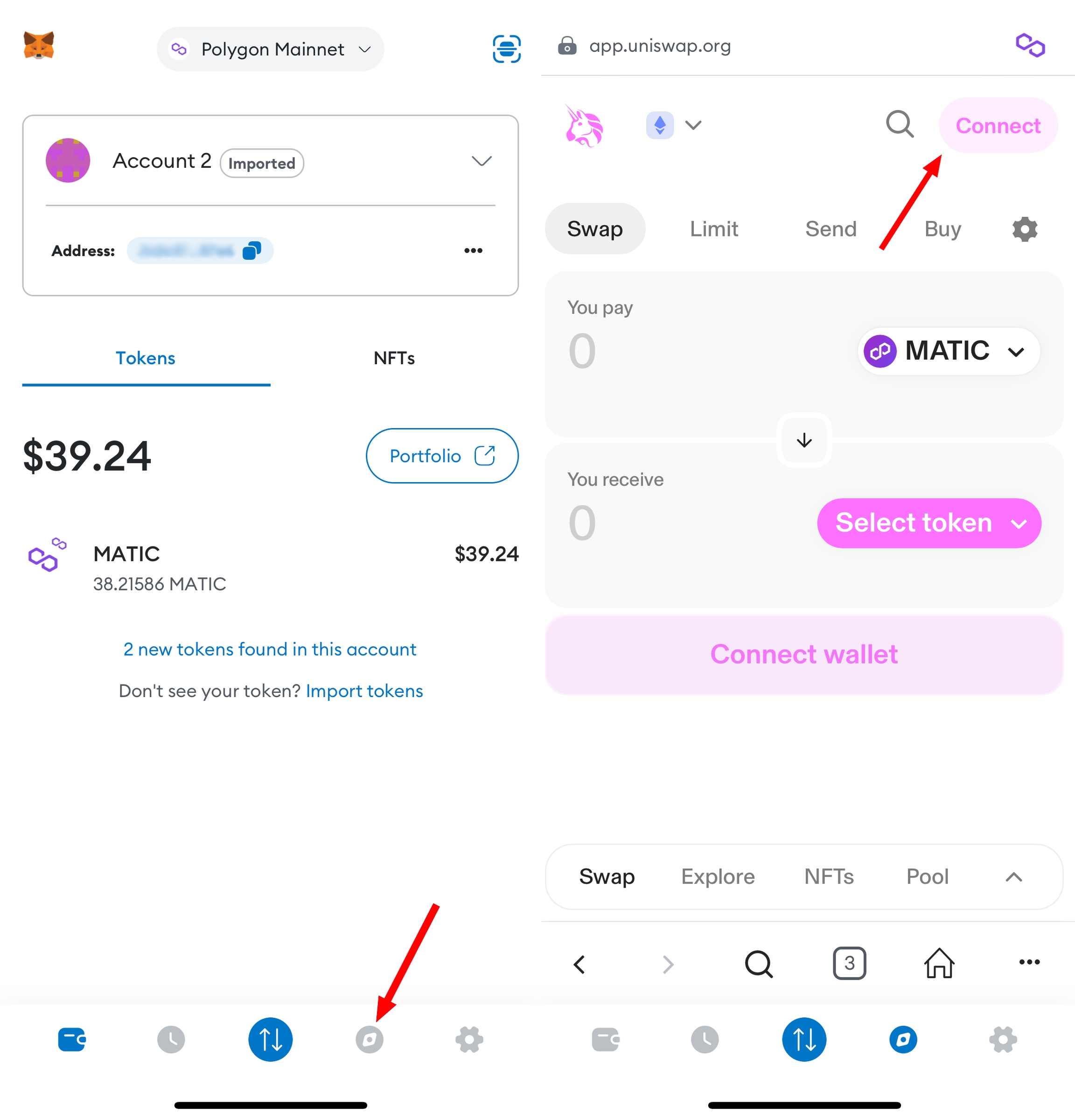 Next, you need to enter MetaMask's internal browser, and in the search bar we insert the address https://app.uniswap.org/swap. On the page that opens, connect our MetaMask wallet.
