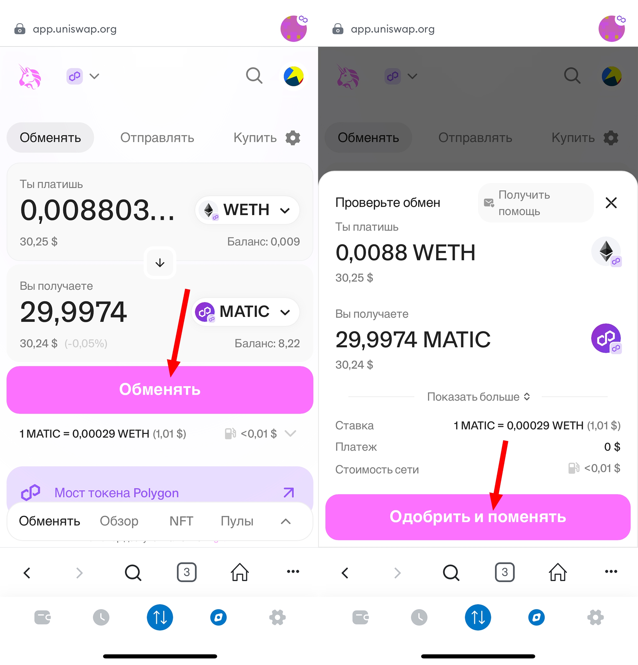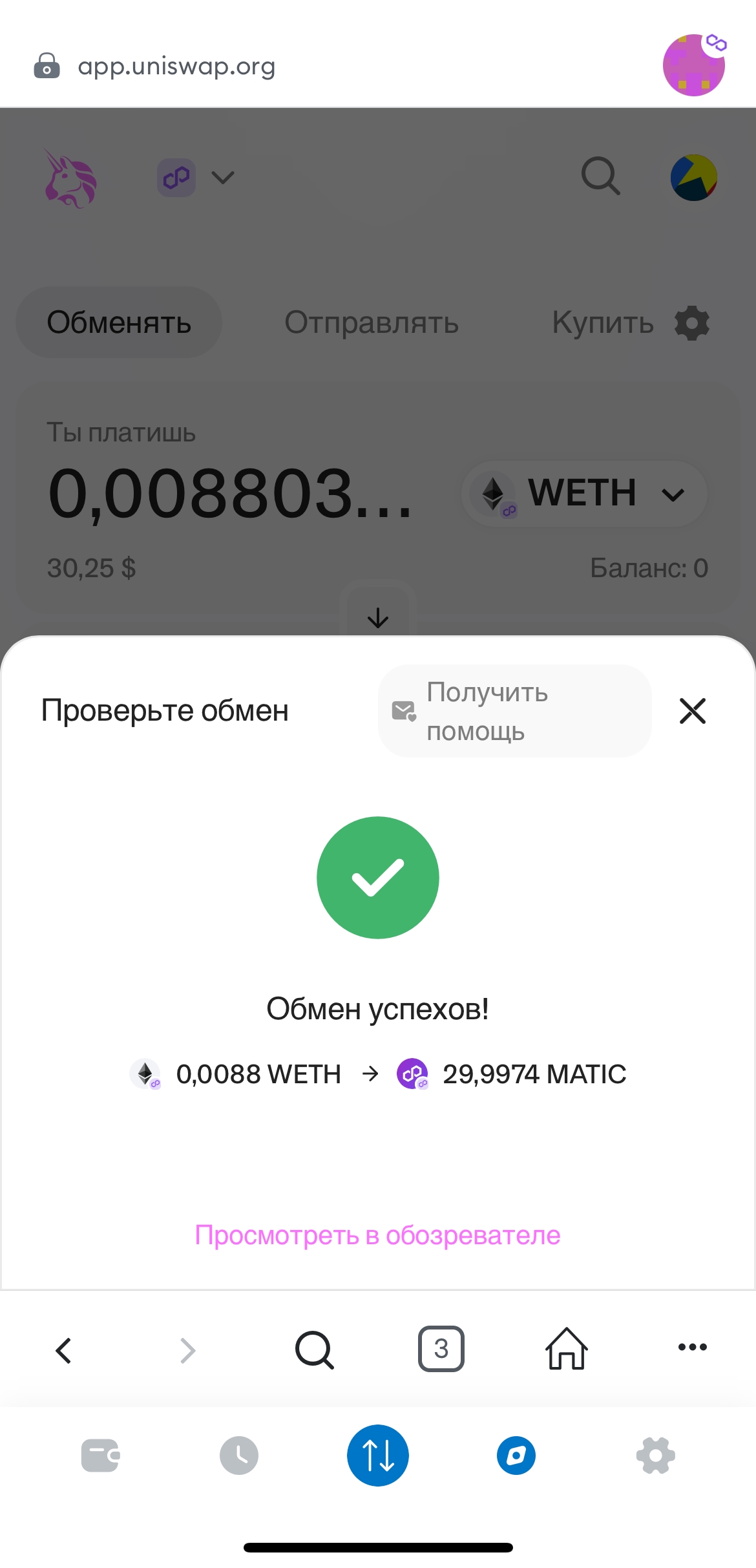 При обмене можете увидеть предварительную сумму обмена. Нажмите "Обменять" и подтвердите транзакцию. Для оплаты транзакции рекомендуется оставить от 0.1 Matic на газ.