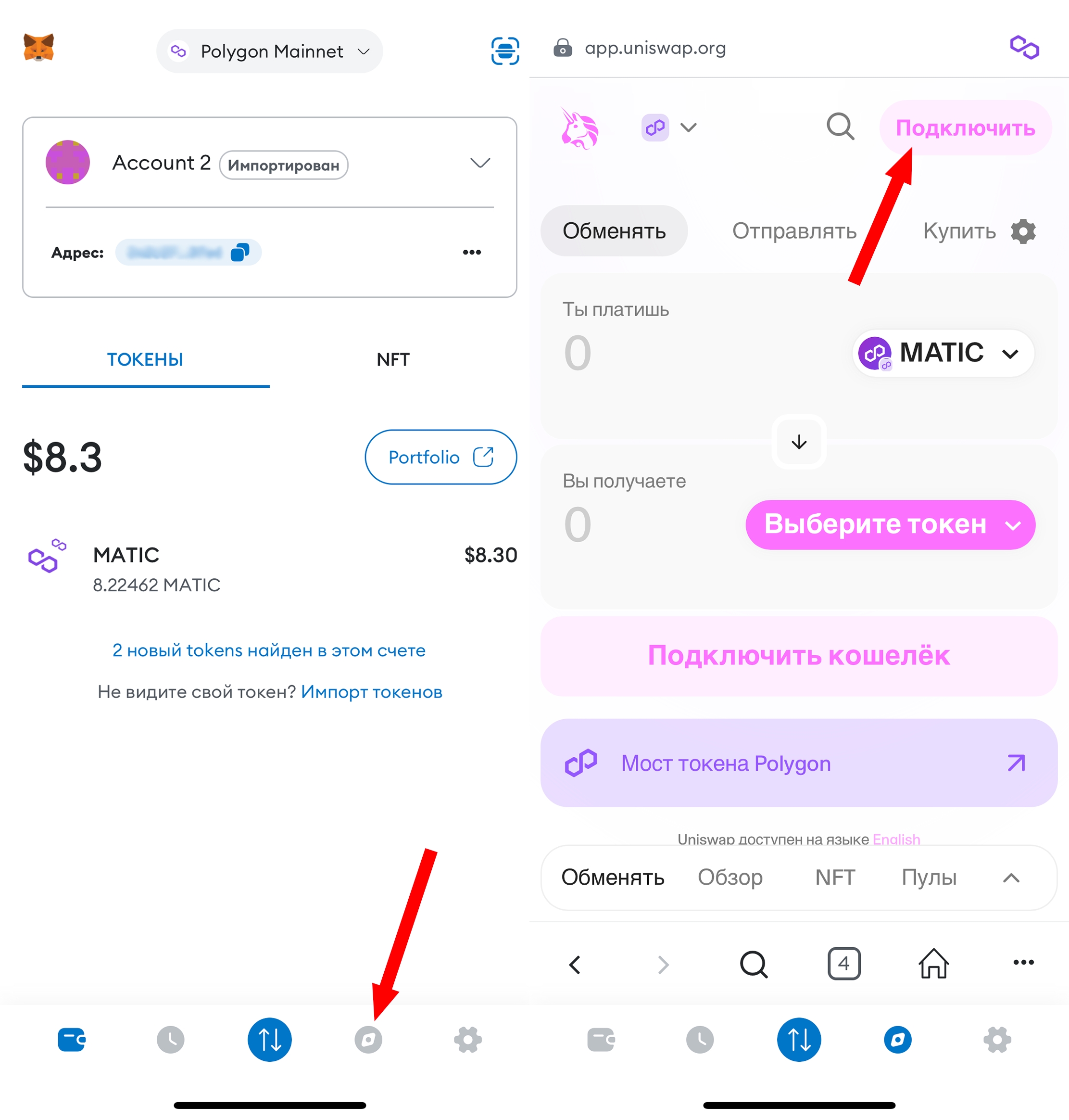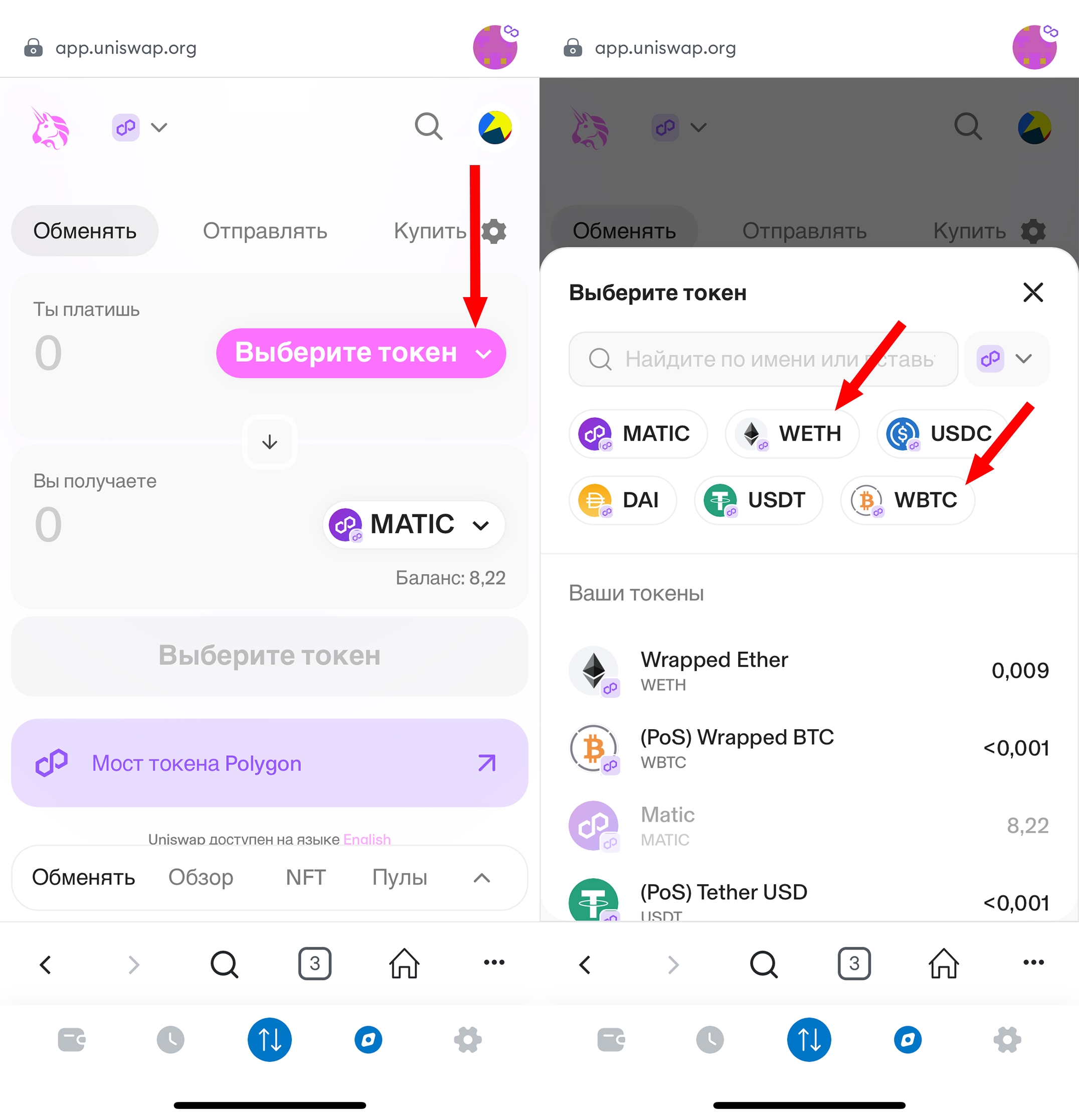 После привязки кошелька выбирите токен, который хотите обменять на Matic. Если в списке не отображаются токены ETH/BTC, то вы можете их найти по адресу контракта. ETH: 0x7ceB23fD6bC0adD59E62ac25578270cFf1b9f619 BTC: 0x1BFD67037B42Cf73acF2047067bd4F2C47D9BfD6