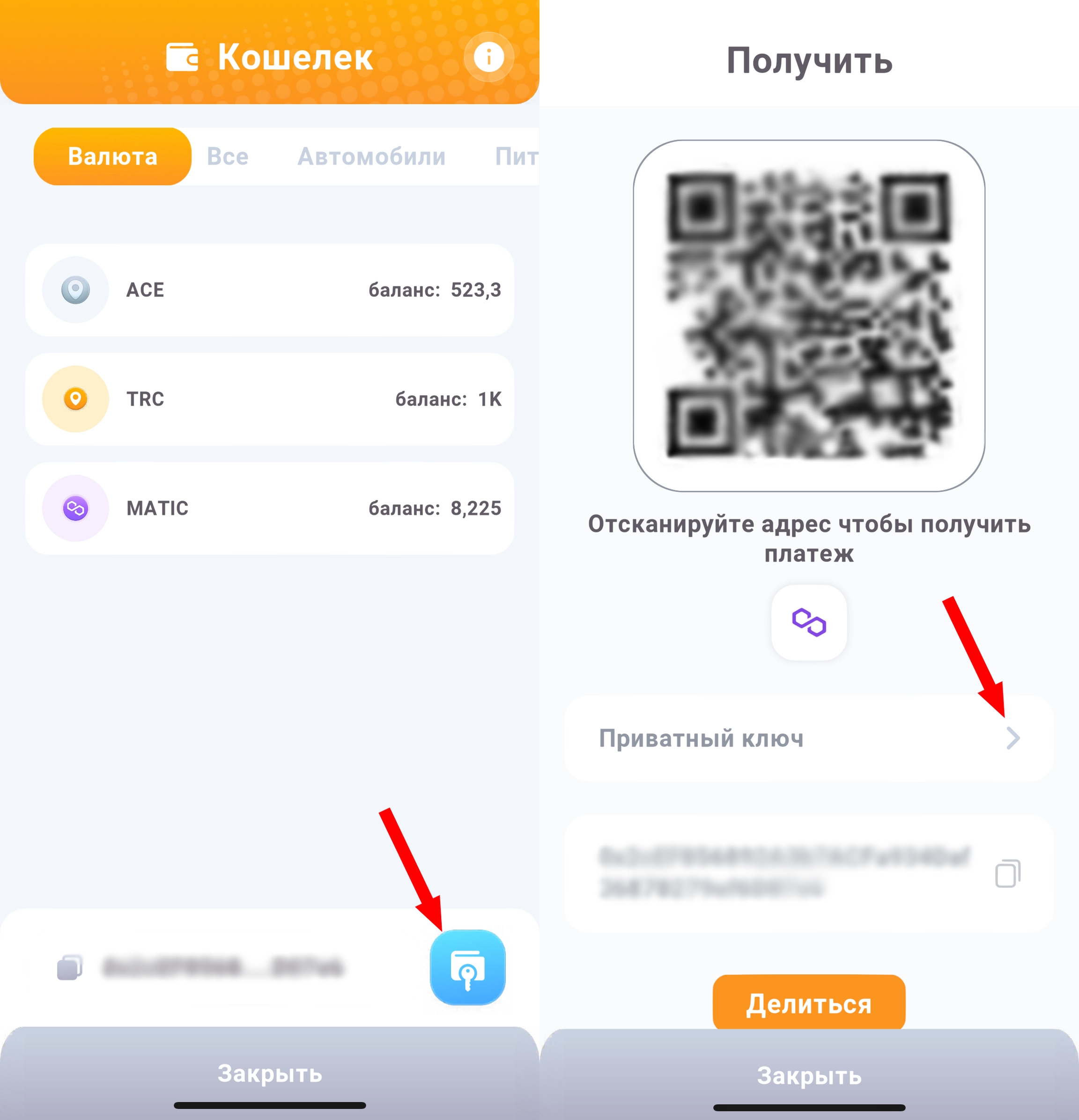 Зайдите в приложение, перейдите в кошелек, далее скопируйте адрес приватного ключа.